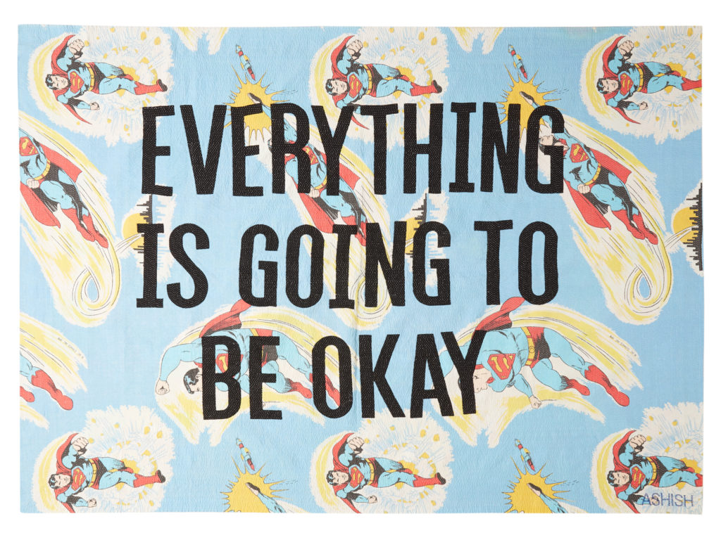 In a knowing clash of references, the collection sees comic-book heroes and Disney princesses juxtaposed against erotic slogans and spiritual affirmations. Whilst more intimate and tender moments are explored with the inclusion of poetry penned by Ashish himself.