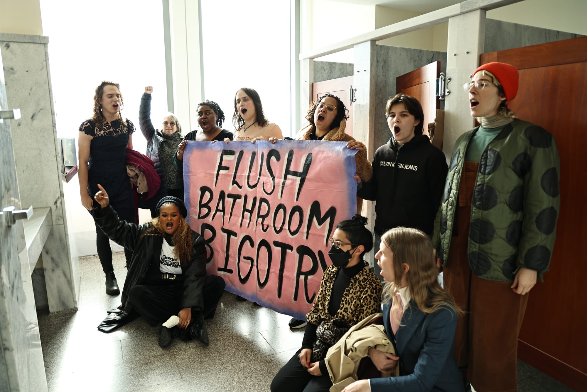 A little over a year ago, I did something I’ve never done as a community organizer: I was arrested alongside fourteen others in a “Bathroom Sit-In,” protesting anti-trans bathroom restrictions on Capitol Hill. Rep. Nancy Mace had begun her switch-up from a supposed LGBTQIA+ ally to a hardline bigot, targeting then–incoming congresswoman Sarah McBride and introducing rules that would bar all trans people from using restrooms in government-owned buildings. She even came outside of the Capitol Police headquarters where we were being held, megaphone in hand, and began to spew anti-trans slurs that have become commonplace for her over the last year.