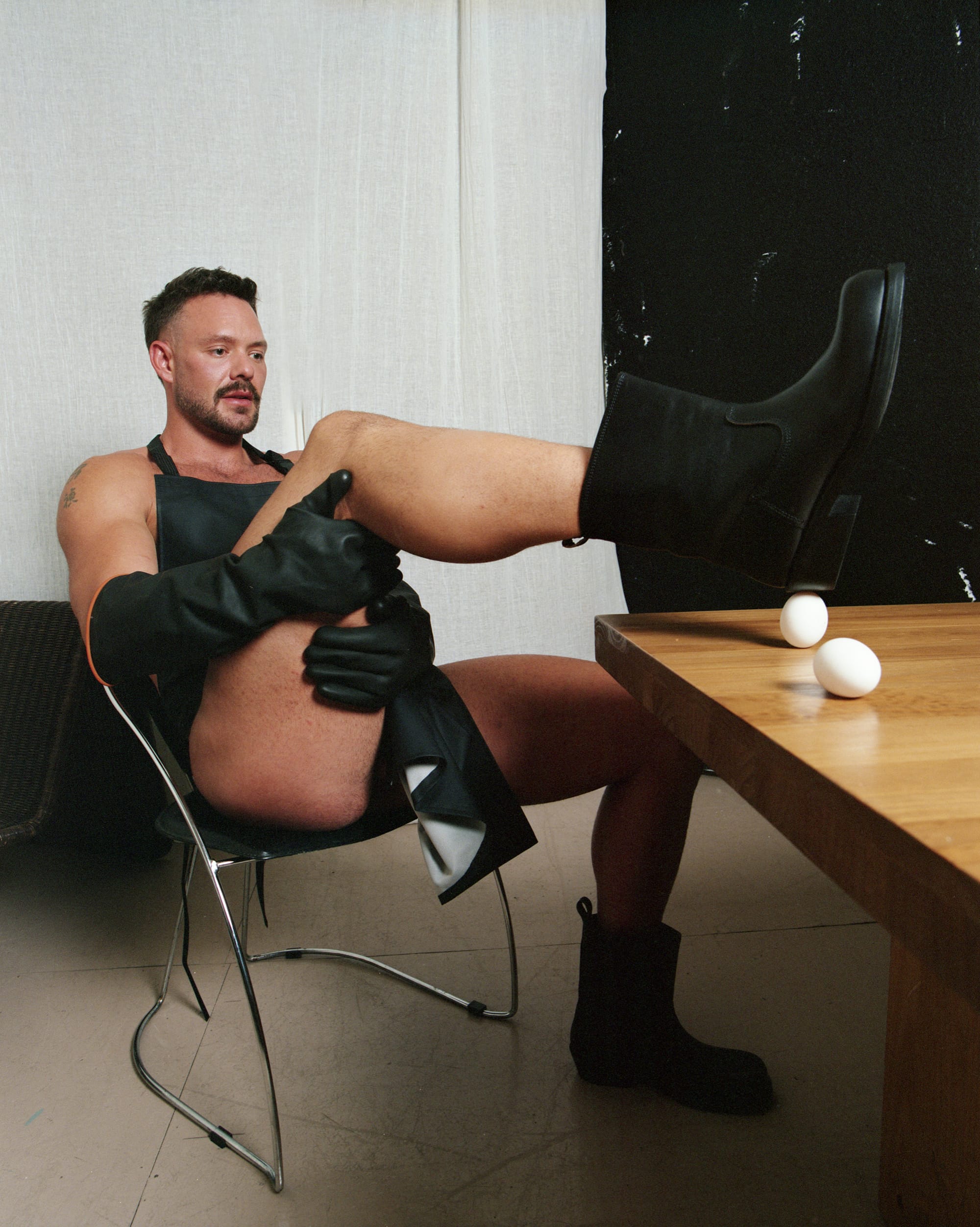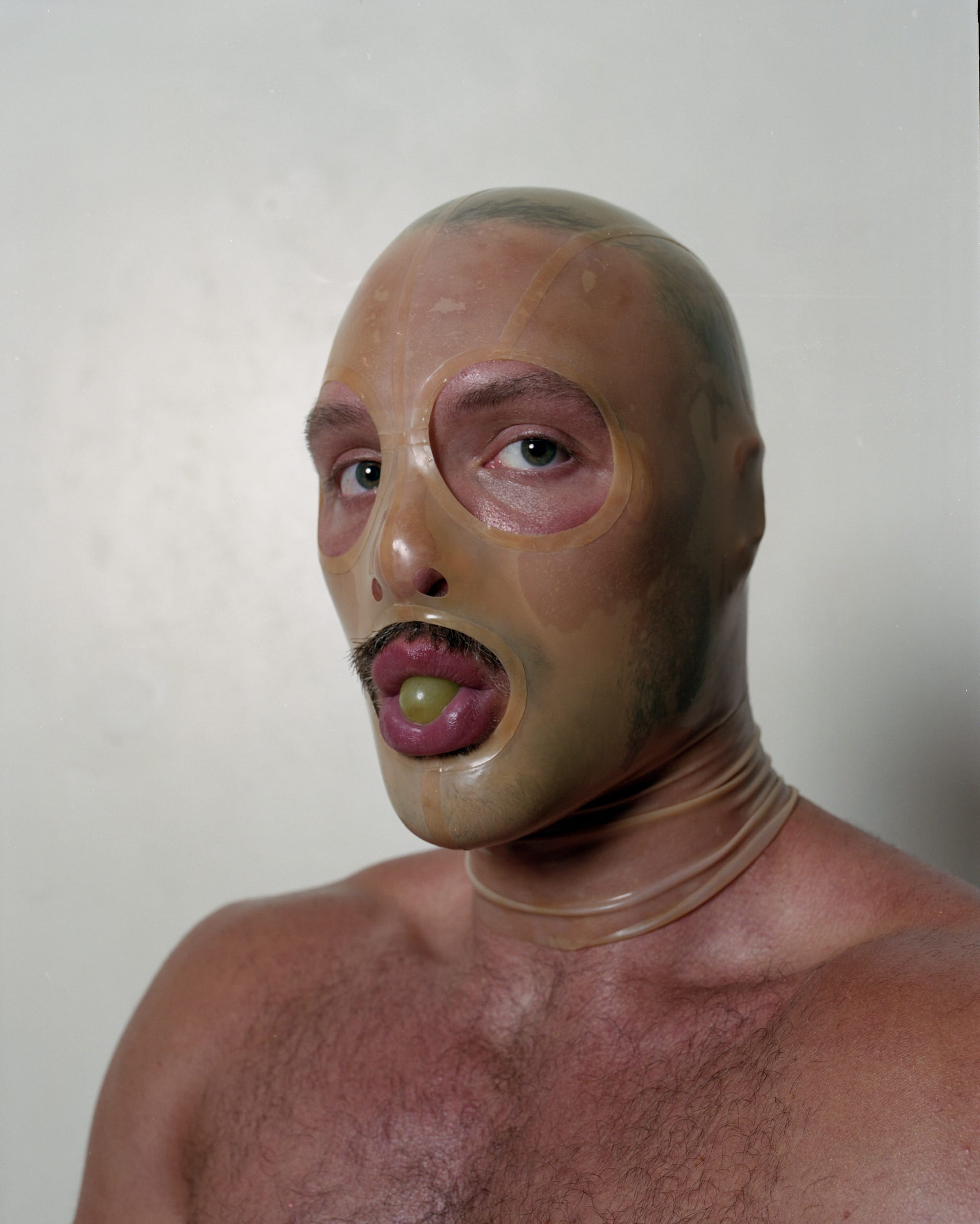 L: Apron STYLIST'S OWN | R: Mask and collar ATSUKO KUDO LATEX, lace jock STYLIST'S OWN