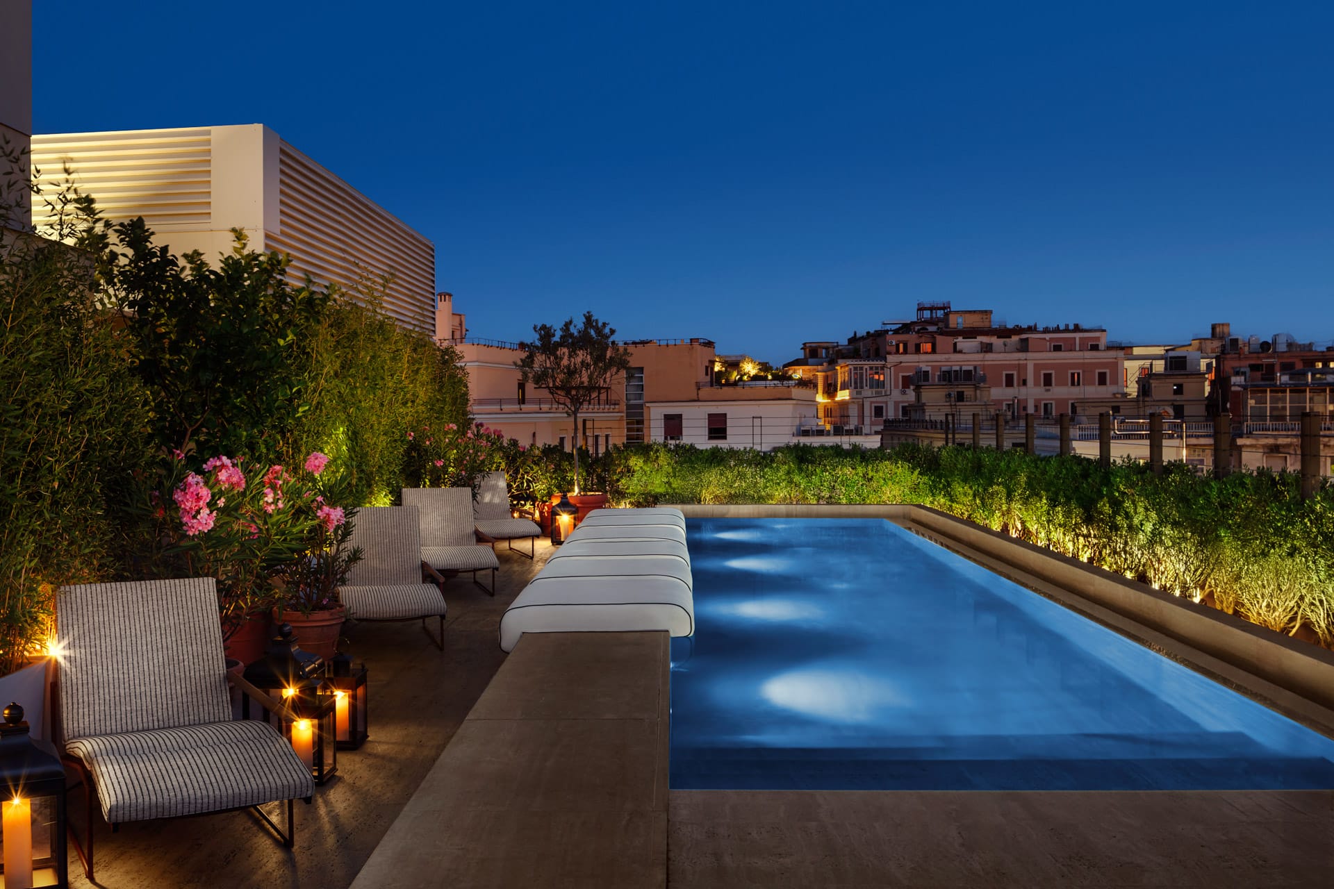 The rooftop pool and terrace sit on the seventh floor and offer what might be the most spectacular view of any EDITION property. Rome's famous terracotta and ochre skyline stretches out before you, that warm, sun-baked palette that gives the city its character, offset against the blue sky in a way that is genuinely breathtaking. The view is to die for. Make sure to stop by at sunset.